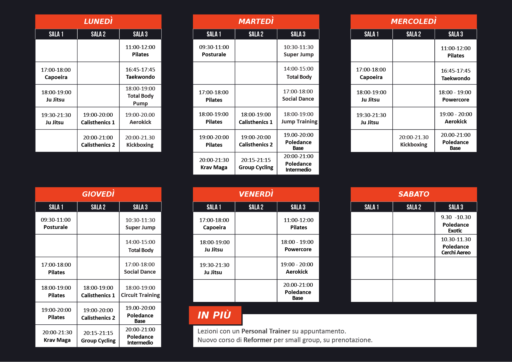 La SALA ATTREZZI è aperta ogni giorno dalle 9.30 alle 22.00, il sabato dalle 9.30 alle 13.30